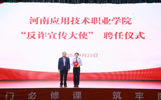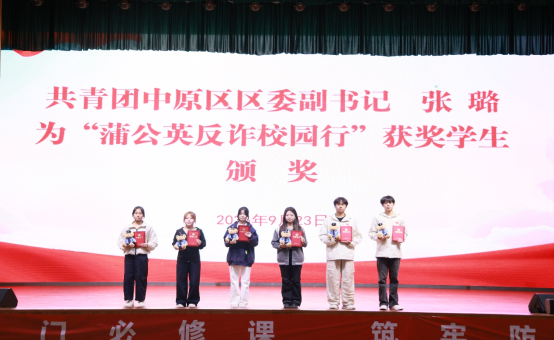 仪式上,张璐为“蒲公英反诈校园行”活动中获奖学生颁奖。黄振中为廖珮旭颁发了“反诈宣传大使”聘书。滕文锐为赵虎林颁发了“总法律顾问”聘书。