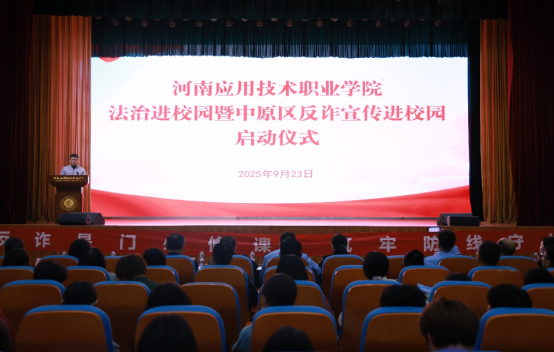 为深入贯彻落实习近平法治思想,切实加强校园法治教育,提升师生法治意识与自我保护能力,9月23日上午,我集团在郑州校区成功举办法治进校园暨中原区反诈宣传进校园启动仪式。郑州市公安局反诈支队副支队长张艳峰,共青团中原区委副书记张璐,郑州市公安局中原反诈大队大队长裴越、民警廖珮旭,郑州市律师协会会长、河南仟问律师事务所主任赵虎林,以及辖区街道办事处、派出所及学校代表来校参加启动仪式。我集团副校长常新中、黄振中、滕文锐出席仪式,相关职能部门及师生代表参加活动。启动仪式由院长办公室主任张凡主持。