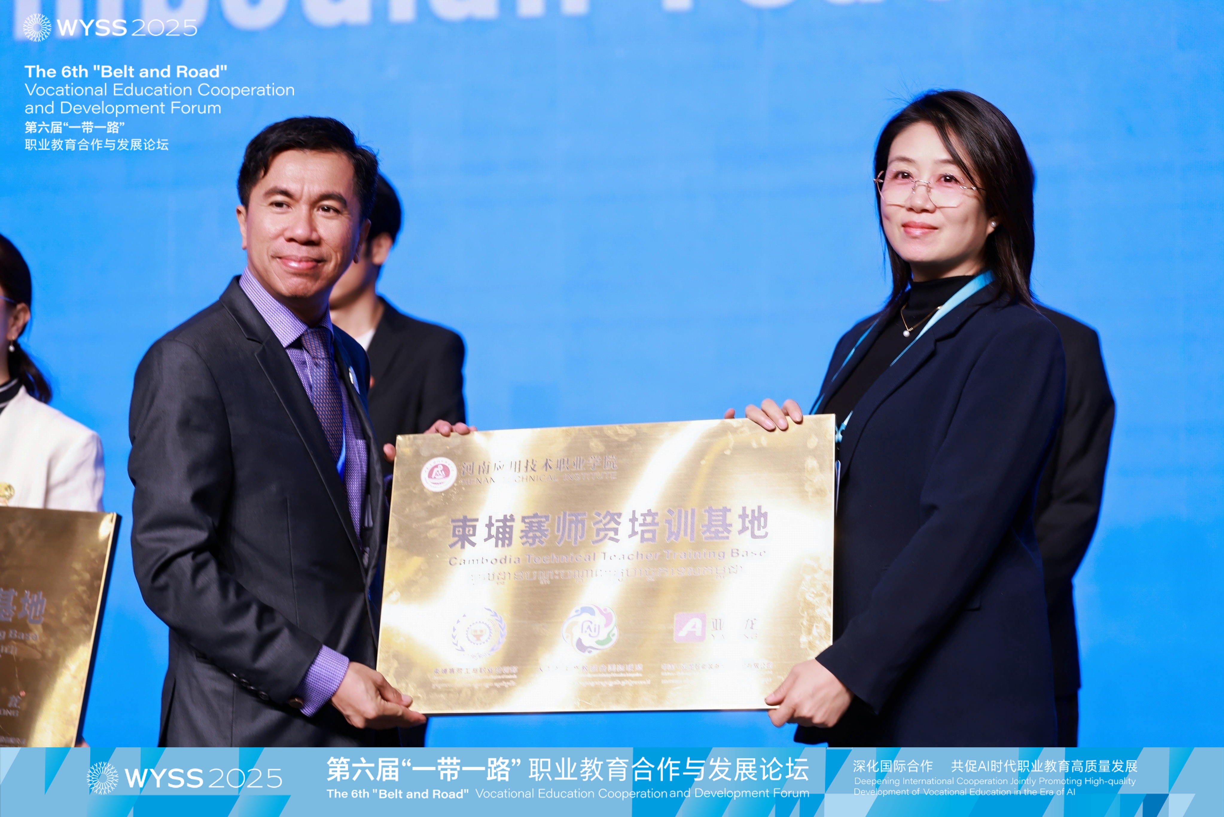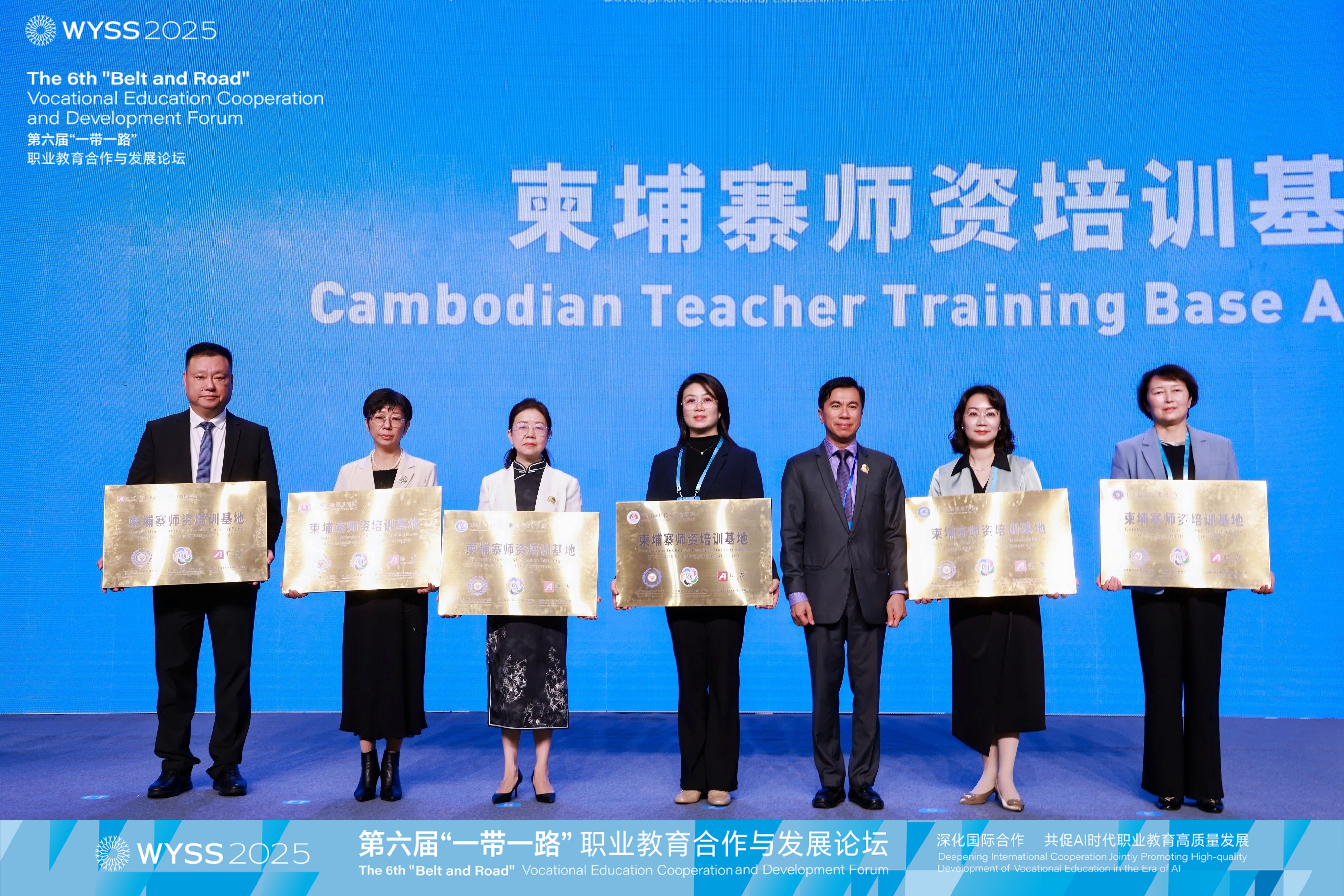 论坛举办期间,一系列重磅成果发布、落地。滕文锐代表学校接受“柬埔寨师资培训基地”授牌。授牌仪式上,柬方对于我集团长期以来在柬方师资培训上的辛勤付出和突出成绩表示认可与感谢。滕文锐表示,学校作为全国三家接受授牌单位之一,将持续锚定职业教育国际化发展目标,抓住数字化发展机遇,深化双方合作,不断为柬埔寨职业教育师资队伍建设注入新动能,推动两国职业教育合作向更深层次、更广领域迈进。