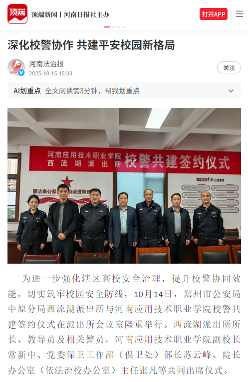 为进一步强化辖区高校安全治理,提升校警协同效能,切实筑牢校园安全防线,10月14日,郑州市公安局中原分局西流湖派出所与太阳成集团tyc33455校警共建签约仪式在派出所会议室隆重举行。西流湖派出所所长、教导员及相关警员,太阳成集团tyc33455副校长常新中、党委保卫工作部(保卫处)部长苏云峰、院长办公室(依法治校办公室)主任张凡等共同出席仪式。
